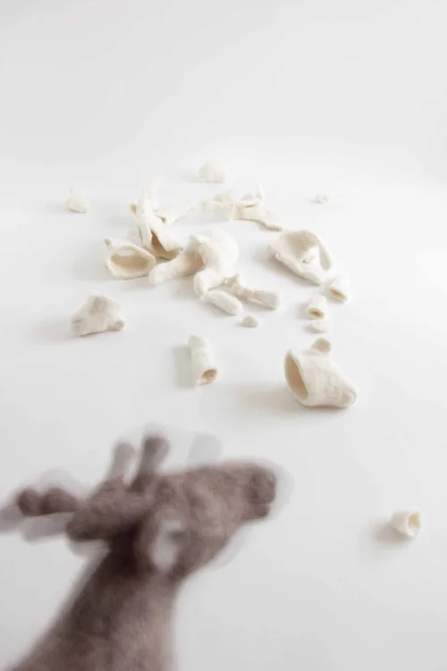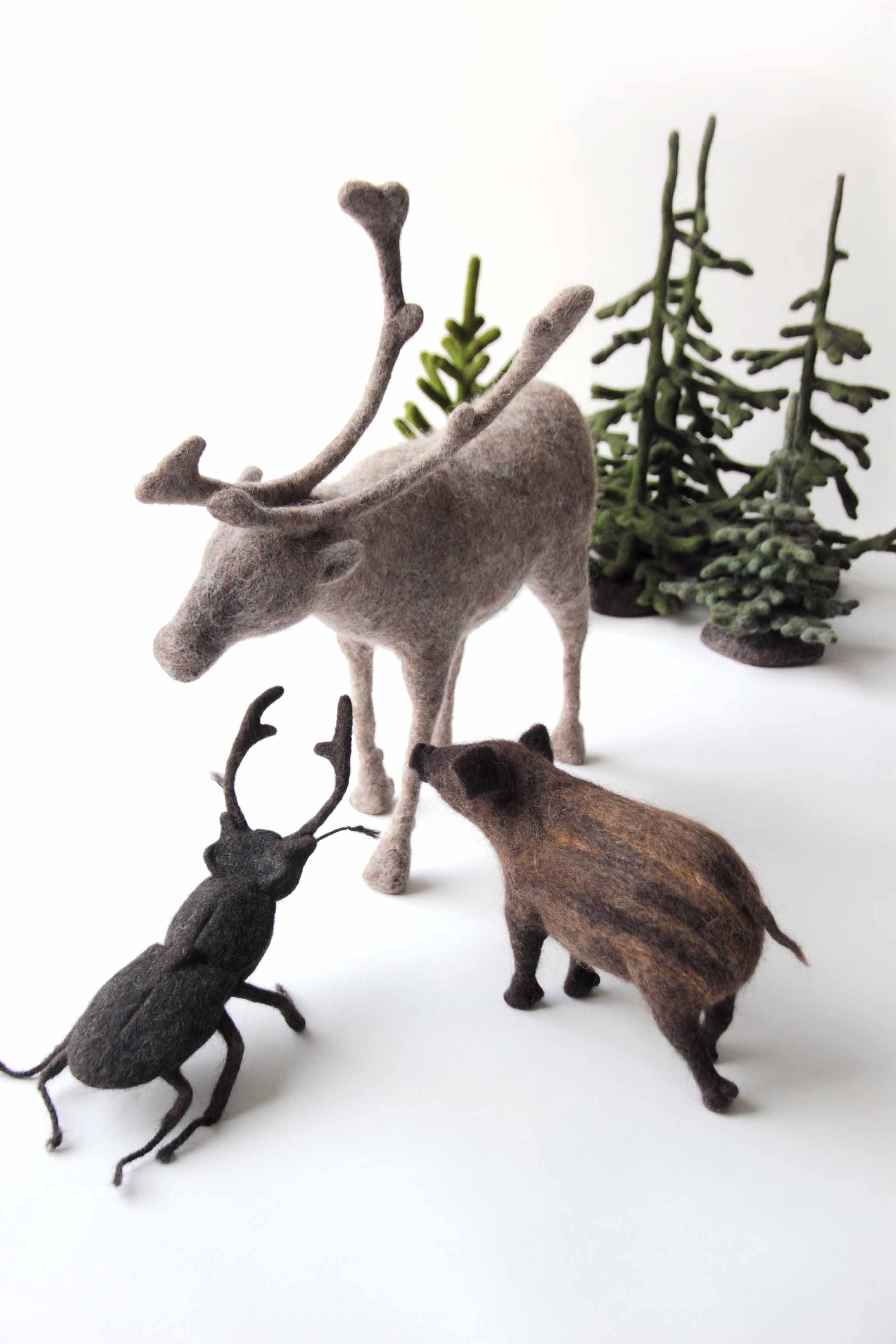 The outdoors is where my work originates from. I spent my childhood along the Danube river in Hungary. Every summer my parents and I would canoe from Budapest up to our camp. My world was filled with the outdoors: frogs, beetles, foxes, wild bores and an imaginary wolf friend. They occupied my mind through songs and events along with Hungarian folk tales, poems, and bedtime stories from illustrated Hungarian picture books. When we immigrated to Canada, the natural world opened up to a vast wilderness. Summers were spent in the Rockies and the Gulf Islands. Later travels to the Canadian Arctic, Iceland, and living in Northern BC with twin toddlers would become the setting for Esti Mese: Sculptures from a Bedtime Story. It is a tale inspired by motherhood and a desire to visually tell a tale to my twins about our roots. Hemlock, Spruce and Pine represent Northern BC. The Caribou, or Tuktu in Inuktitut, the Arctic. Beetle, the Danube River, and Boar, a Hungarian forest.