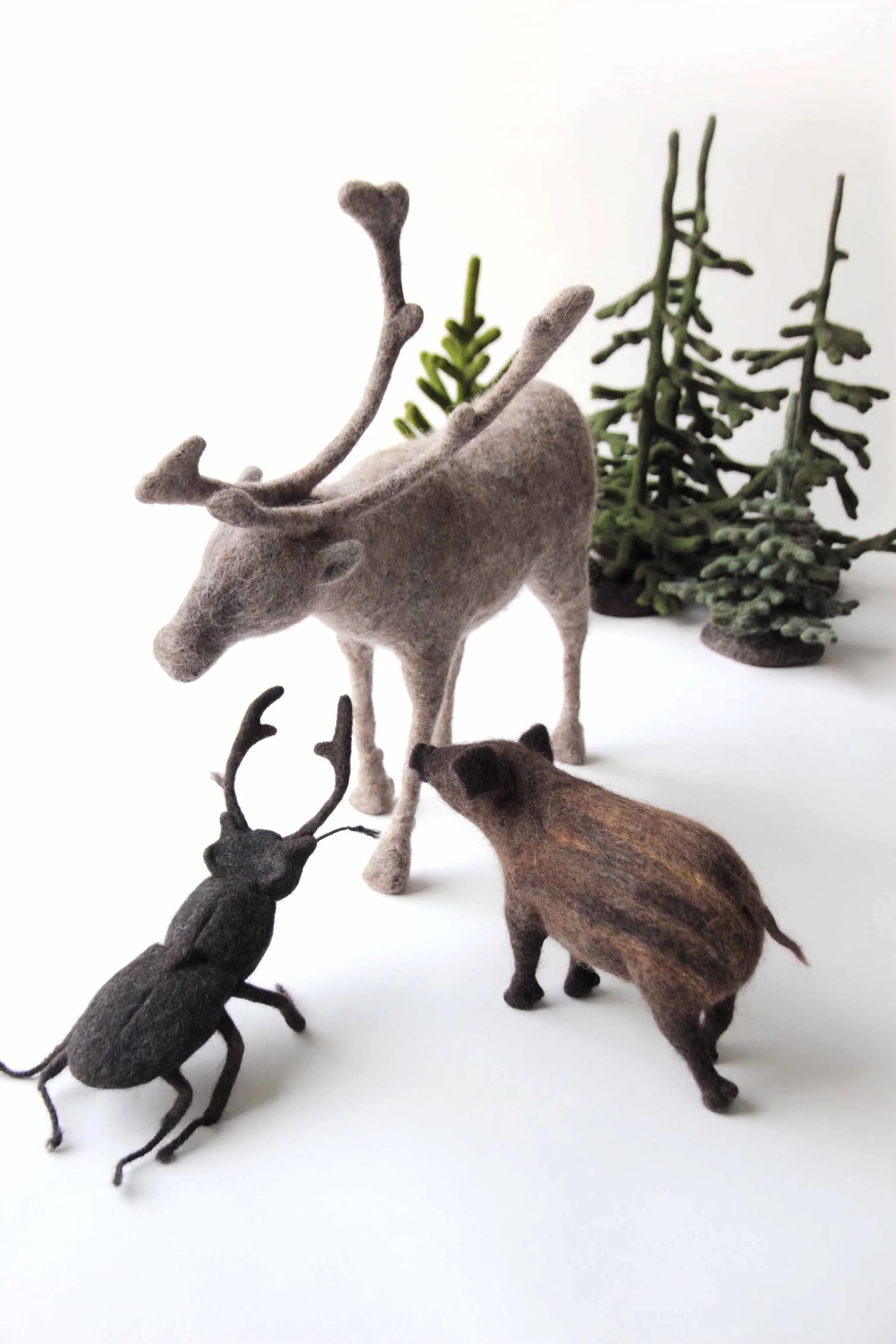 The outdoors is where my work originates from. I spent my childhood along the Danube river in Hungary. Every summer my parents and I would canoe from Budapest up to our camp. My world was filled with the outdoors: frogs, beetles, foxes, wild bores and an imaginary wolf friend. They occupied my mind through songs and events along with Hungarian folk tales, poems, and bedtime stories from illustrated Hungarian picture books. When we immigrated to Canada, the natural world opened up to a vast wilderness. Summers were spent in the Rockies and the Gulf Islands. Later travels to the Canadian Arctic, Iceland, and living in Northern BC with twin toddlers would become the setting for Esti Mese: Sculptures from a Bedtime Story. It is a tale inspired by motherhood and a desire to visually tell a tale to my twins about our roots. Hemlock, Spruce and Pine represent Northern BC. The Caribou, or Tuktu in Inuktitut, the Arctic. Beetle, the Danube River, and Boar, a Hungarian forest.